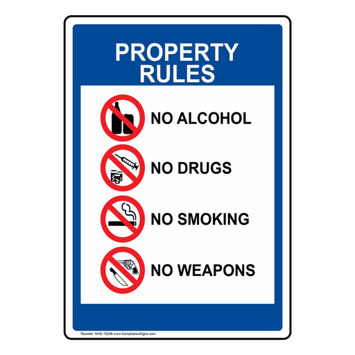 View full details"PROPERTY RULES, NO ALCOHOL, NO DRUGS, NO SMOKING, NO WEAPONS" - Safety Sign, Rigid Plastic, 14"x10"