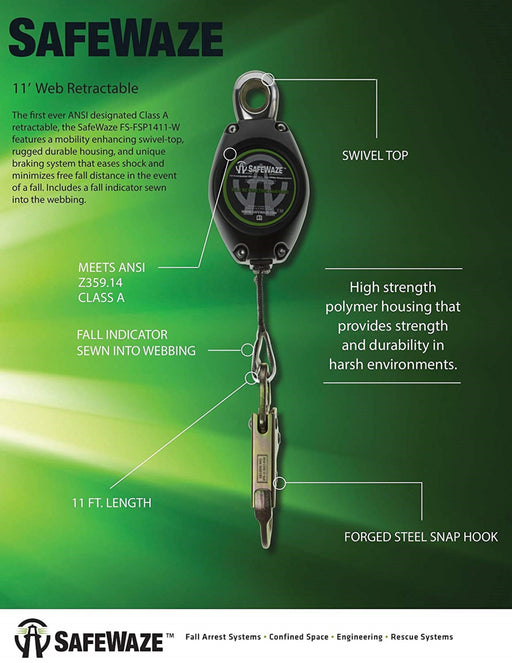 The SafeWaze FS-FSP1411-W 11′ web retractable lifeline (SRL) features a mobility enhancing swivel-top, rugged durable housing, and unique braking ...
