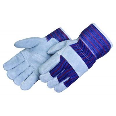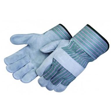 Standard split cowhide leather palm, fingertips and knuckle strap gloves, rubberized safety cuff, cotton hem, wing thumb Features 2 1/2" rubber...