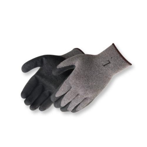 Textured black latex coated cotton/poly string knit glove Textured black latex palm coated Greystring knit shell 10 Gauge Elastic knit wri...
