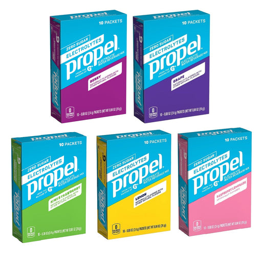 Mix up your workout with Propel Powder Packets Raspberry Lemonade, Berry, Grape, Lemon, Kiwi Strawberry with Electrolytes, Vitamins and No Sugar. ...