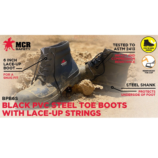 6 Inch Lace-up boot with steel toe and steel shank MCR Safety has you covered when in need of foot protection. The BPB6S is a 6 Inch Lace Up black...