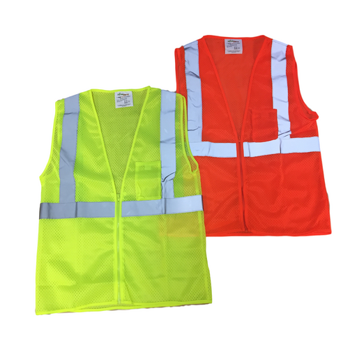 ANSI 107 Type R, Class 2 Economy Safety Vest. 100% Polyester mesh. Zipper front closure. 2 exterior waist pockets and 1 left chest pocket with pen ...