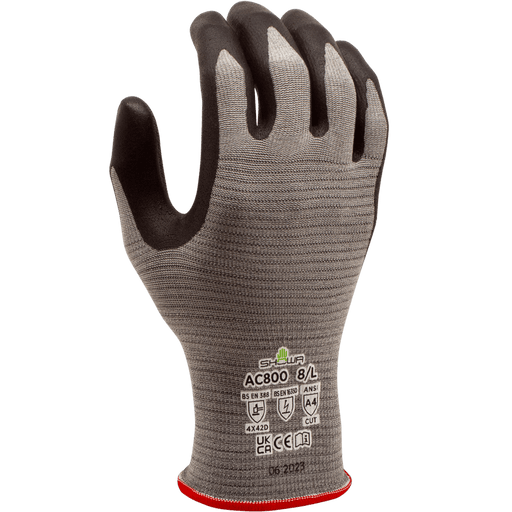 SHOWA AC800 ANSI CUT LEVEL A4 The new AC800 has a microporous nitrile with conductive filler, and embossed S-shaped palm finish. 18-gauge seamle...